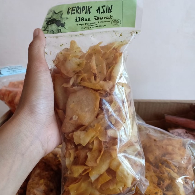 Keripik dengan sensasi pedas, manis, gurih dan asin tergabung menjadi satu . Cocok buat cemilan dan lauk makan.