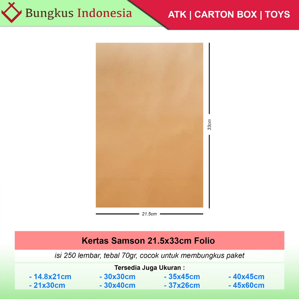 Kertas folio ukuran 21.5x33cm, ketebalan 70gr, isi 250 lembar. cocok digunakan untuk membungkus paket