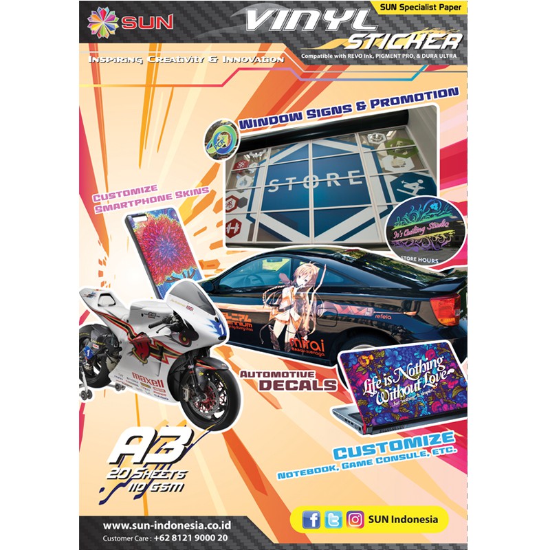 Kini telah hadir kertas Vinyl pertama di Indonesia yang mampu dicetak menggunakan printer rumahan (printer dengan tinta biasa/dye based). Bagi anda yang bergelut di bidang usaha makanan, aksesoris motor, aksesoris handphone, poster, dsb, Stiker vinyl ini dapat menjadi sahabat berwirausaha anda. Selain berbahan dasar semi plastik, sticker vinyl ini juga memiliki daya rekat yang lebih kuat dibandingkan dengan sticker vinyl pada umumnya namun tidak meninggalkan bekas jika dilepas. Ditambah lagi dengan grammatur yang tipis, membuat sticker ini mampu merekat di permukaan yang melengkung bahkan tidak rata sekalipun.