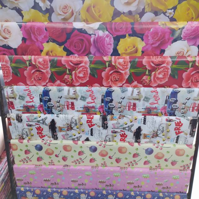 Kertas kado anak- anak dan gambar bunga masih banyak macemnya