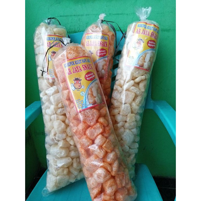 Kerupuk kulit sapi dengan 2 varian yaitu asin dan pedas. Berat 1 kemasan 200 gr.