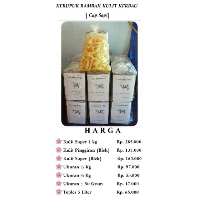 -Kerupuk kulit kerbau merupakan kerupuk yang membutuhkan waktu lama dalam proses pembuatanya. Hampir 7 hari lamanya proses pembuatan sebuah kulit kerbau menjadi sebuah kerupuk, tak heran harga yang di tawarkan sebanding dalam proses pembuatanya.