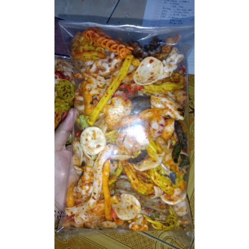 Seblak Mix berisi campuran kerupuk seblak, makaroni, mie kremes, siomay kering, dan bumbu rempah khas seblak yang bikin nagih