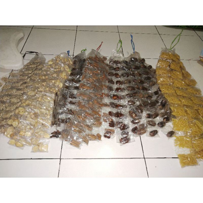 Aneka bumbu kering (rempah-rempah) kemasan renceng.