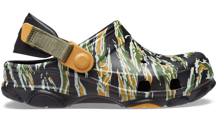 Travel. Exploration. Adventures near and far. This All-Terrain Clog, with its heritage-inspired camo print, is your perfect adventure-ready companion. The rugged tread pattern and rubber pods add traction and support while the adjustable turbo strap and ventilation ports make sure this clog keeps up with an outdoorsy lifestyle. Lightweight Croslite™ foam construction makes them a practical choice for any outing. Flip that strap back and go wild. Kids' All-Terrain Camo Clog Details: • Heritage-inspired camo print • Rugged lug outsoles with enhanced tread for increased traction and support • Fully molded Croslite™ foam uppers • Ventilation ports add breathability and help shed water • Easy to clean and quick to dry • Adjustable turbo heel straps for a snug, accommodating fit • Customizable with Jibbitz™ charms • Iconic Crocs Comfort™: Lightweight. Flexible. 360-degree comfort.