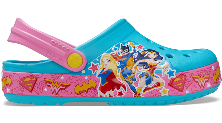 Real Fun Shoes For Real Fun Kids It may not come with a cape, but your little one will feel like saving the world in these ones. This new clog featuring a DC Super Hero graphic patch is sure to become your little one's new favorite go-to shoe for school, play days and adventures of all kinds. Crocs Fun Lab styles feature original character-rich graphics and other inspired designs to help kids express themselves and engage new friends, resulting in more fun for the little ones. Kids' Crocs Fun Lab DC Super Hero Band Clog Details: Uppers featuring DC Super Hero graphics where kids can interact with them Pivoting heel straps for a more secure fit Croslite™ foam for support and comfort Customizable with Jibbitz™ charms Iconic Crocs Comfort™: Lightweight. Flexible. 360-degree comfort. © & ™ DC Comics and Warner Bros. Entertainment Inc.