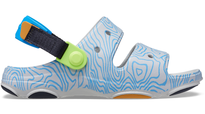 Travel. Exploration. Adventures near and far. The look and feel of our Kids’ Classic All-Terrain Clog, now in sandal form and featuring a topographic map graphic. The rugged tread pattern and rubber pods add traction and support, while the two-strap upper and adjustable turbo backstraps work to keep up with their outdoorsy lifestyle. Seven holes in each sandal allow for personalization with Jibbitz™ charms and a lightweight Croslite™ foam construction makes them a practical choice for any outing. Flip that strap back and go wild. Kids’ All-Terrain Topographic Sandal Details: Two-strap upper Topographic map graphic Adjustable turbo heel straps for a snug, accommodating fit Rugged lug outsoles with enhanced tread for increased traction and support Fully molded Croslite™ foam uppers Easy to clean and quick to dry Customizable with Jibbitz™ charms Iconic Crocs Comfort™: Lightweight. Flexible. 360-degree comfort.
