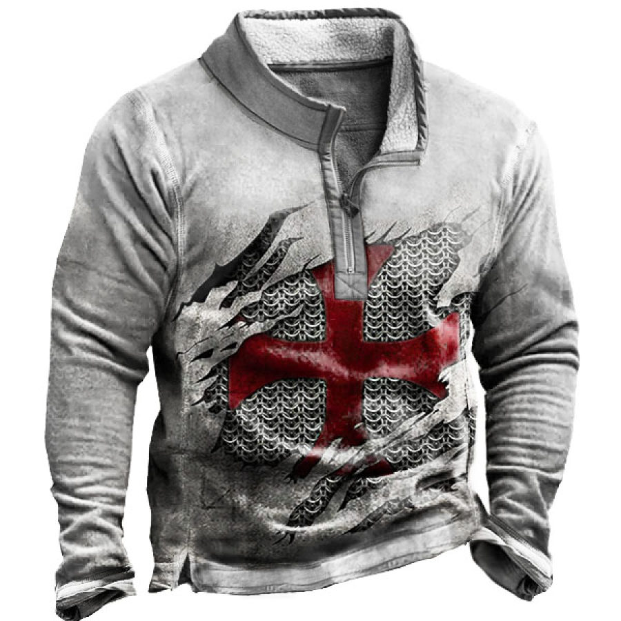 Knights Templar Print Zip Half Collar Thermal Men Sweatshirt