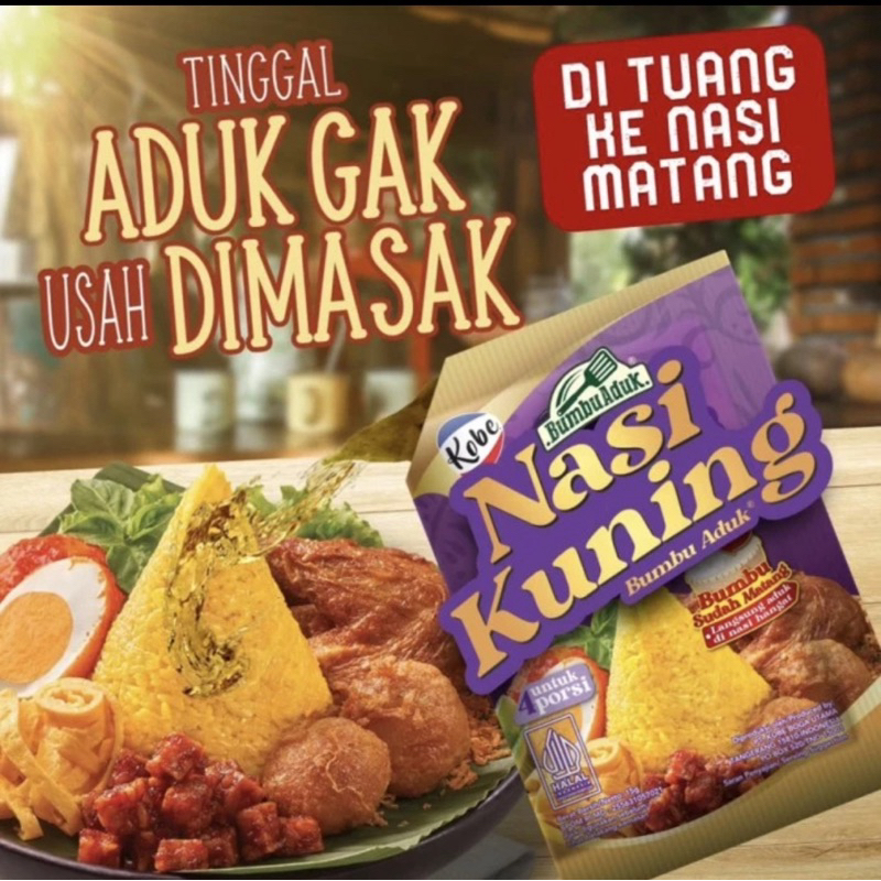 Kobe Bumbu Aduk Nasi Kuning adalah bumbu aduk matang untuk membuat nasi kuning lezat dalam sekejap. Tinggal aduk Kobe Bumbu Aduk Nasi Kuning ke nasi hangat, nasi putih biasa langsung disulap menjadi nasi kuning lezat dengan seketika.
