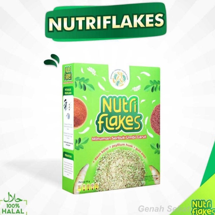 Nutriflakes merupakan produk makanan sehat (super food) berbentuk bubur sereal yang sekaligus mengandung efek terapi, mengandung bahan aktif utama pati umbi garut, daun kelor, dan psylium husk. Yang memiliki manfaat untuk penyebuhan asam lambung, pencernaan, antivirus, antidepresan, antiinflamasi, meningkatkan antibody, dan mengontrol kadar gula darah. Mengandung bahan tambahn seperti gula aren, susu kambing etawa, madu, krimer dan perisa sintetik vanilla sehingga membuat kombinasi menjadi sempurna.