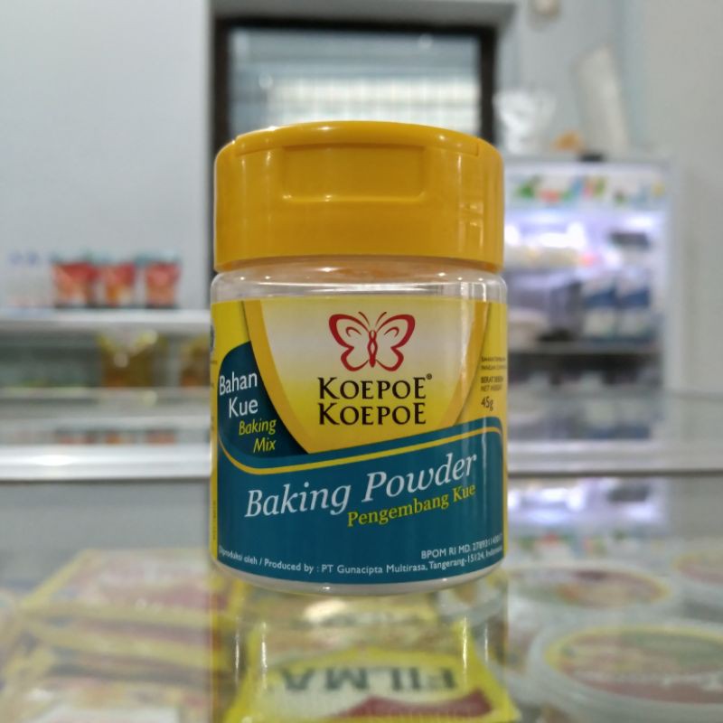 Baking Powder Koepoe Koepoe digunakan untuk mengembangkan berbagai macam adonan kue, bolu, roti, dan biskuit. dibuat dengan bahan pilihan dan bermutu tinggi untuk kesempurnaan kue.