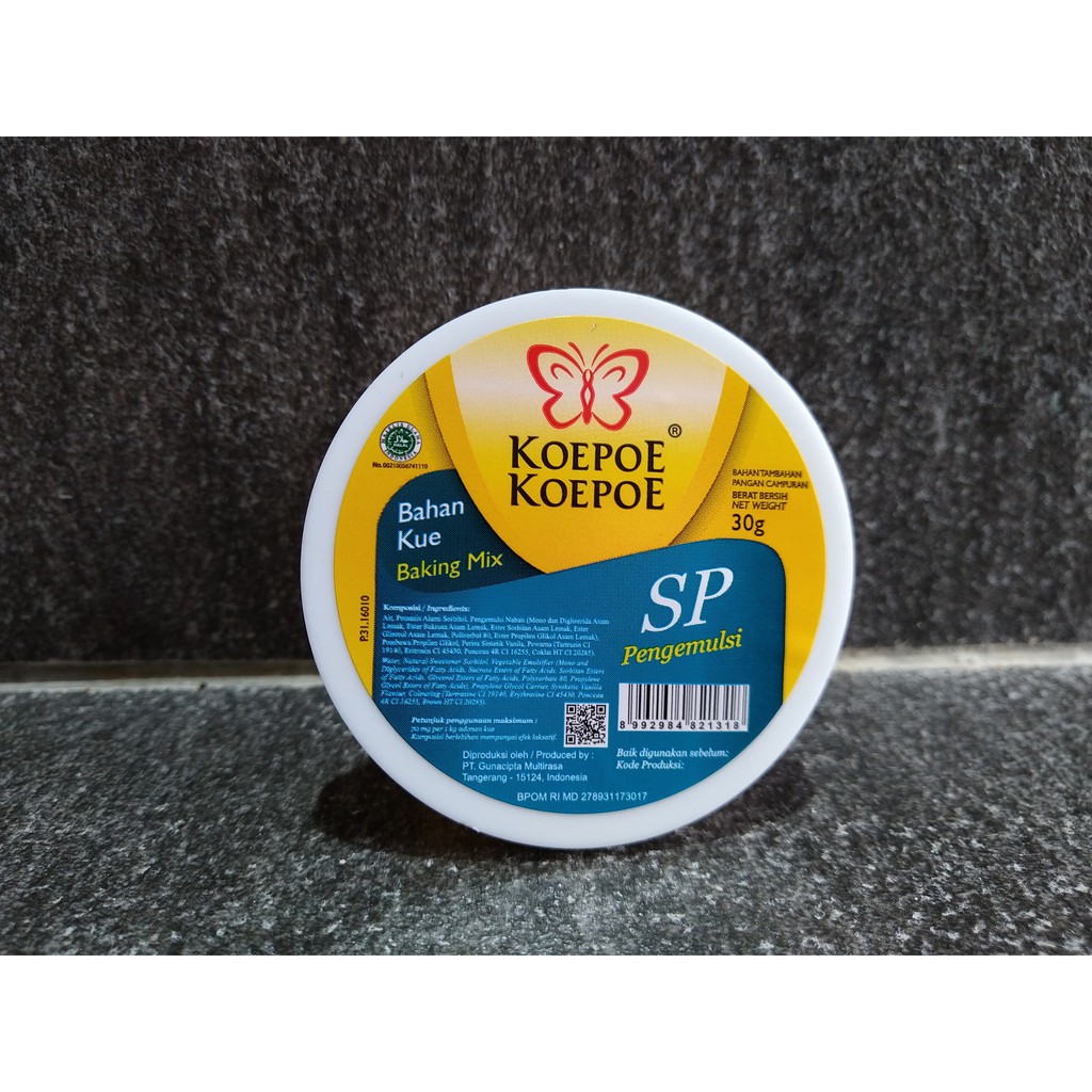 Koepoe Koepoe S P 30gr merupakan bahan pengembang yang dapat membuat kue mengembang dengan baik sekaligus membuat tekstur kue menjadi lembut.