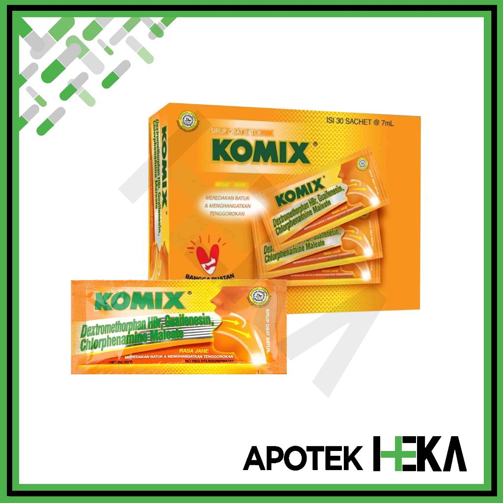 KOMIX RASA JAHE merupakan sirup batuk yang dikemas dalam sachet berukuran 7 ml dengan rasa Jahe. Obat ini mengandung Guaifenesin, Dextromethorphan HBr, dan Chlorpheniramin Maleate yang berkhasiat membantu meredakan batuk dan menghangatkan tenggorokan. KOMIX bekerja sebagai antitusif untuk mengurangi gejala batuk, antihistamin untuk meredakan batuk, dan ekspektoran untuk mengeluarkan dahak.