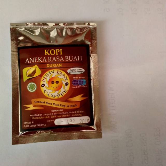 Kopi Aneka Rasa Buah dengan varian rasa Durian.Dibuat dari kopi robusta lampung berkualitas dan ditambahkan kerimer nabati serta gula dan komponen utama ektra buah dari buah asli yg di keringkan dengan cara di oven sehingga menghasilkan rasa yg seimbang antara kopi dan buah.