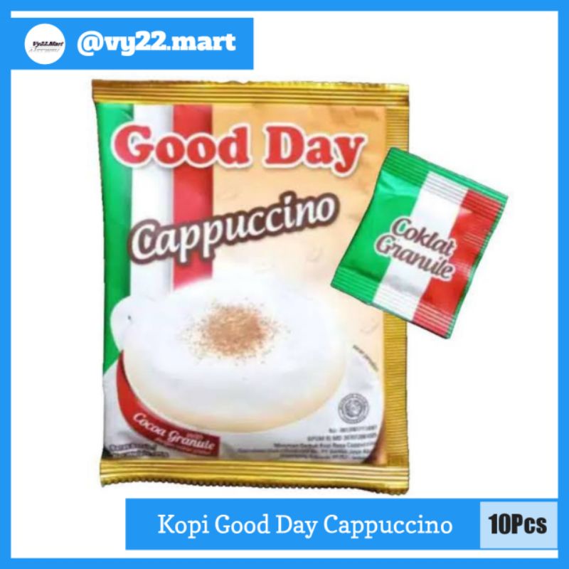 Good Day Cappuccino isi 10 pcs merupakan kopi bubuk yang terbuat dari biji kopi pilihan.