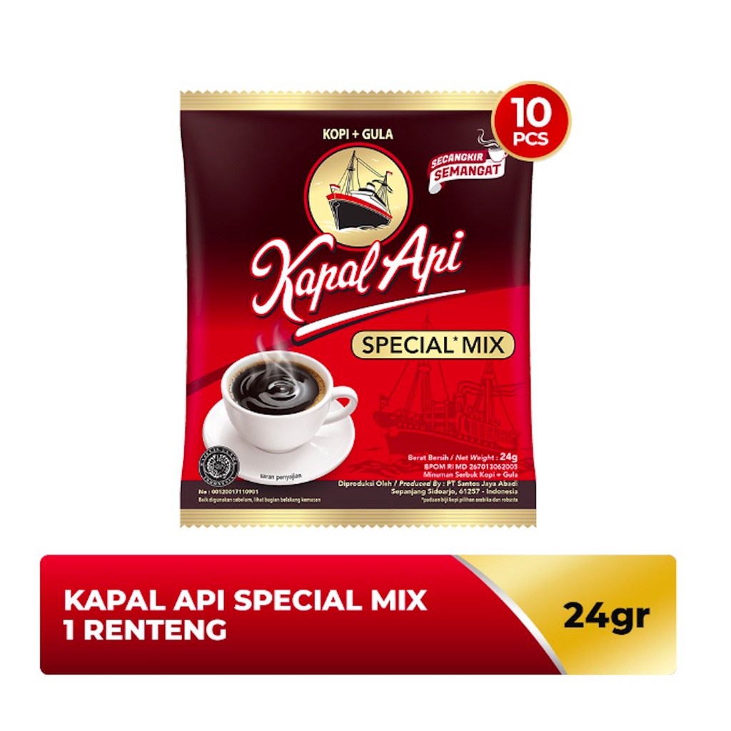 Kopi Kapal Api Special Mix terbuat dari paduan biji kopi berkualitas "Special" dan gula, menghasilkan aroma dan rasa yang jelas lebih enak, siap memberikan semangat untuk memulai hari.