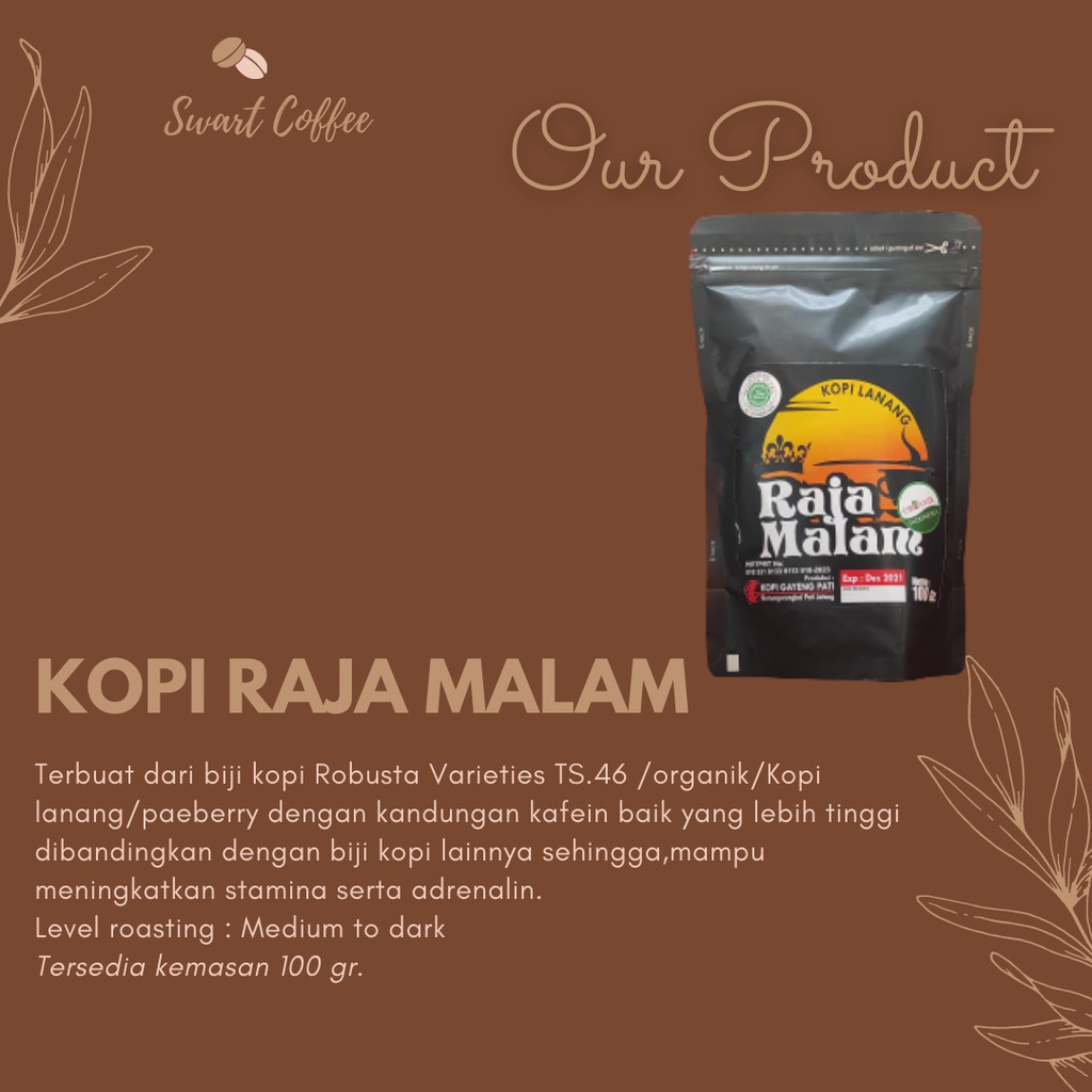Kopi Raja Malam terbuat dari biji kopi Robusta Varieties TS.46/organik/Kopi lanang/ poeberry dengan kandungan kafein baik yang lebih tinggi dibandingkan dengan biji kopi lainnya sehingga, mampu meningkatkan stamina serta adrenalin.