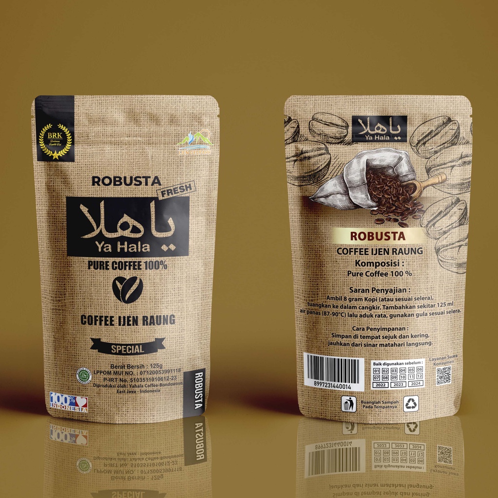 Ya Hala Coffee Robusta Ijen Raung merupakan bubuk kopi Robusta yang telah diolah dengan memilih biji kopi dari Lereng Gunung Ijen dan Gunung Raung pilihan, yang memiliki kualitas tinggi serta mempunyai Indikasi Geografis Java Ijen-Raung. Dengan melalui proses panjang dari panen dan double sortasi (sebelum roasting dan sesudah roasting) agar benar-benar hanya biji kopi berkualitas tinggi yang diproses menjadi bubuk. Sehingga tidak terdapat kecacatan pada fisik kopi yang dapat menghasilkan rasa-rasa tidak menyenangkan dalam kopi.