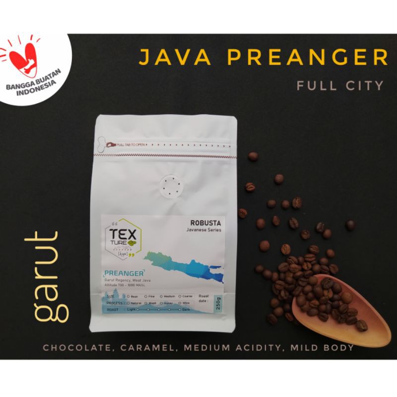 Dalam kemasan berisi 100% Kopi Robusta Grade 1 yang diproses pasca panen dengan metode Natural dan disangrai sampai tingkat Medium-Dark (Full City Roast) menghasilkan cita rasa khas kopi robusta Garut.