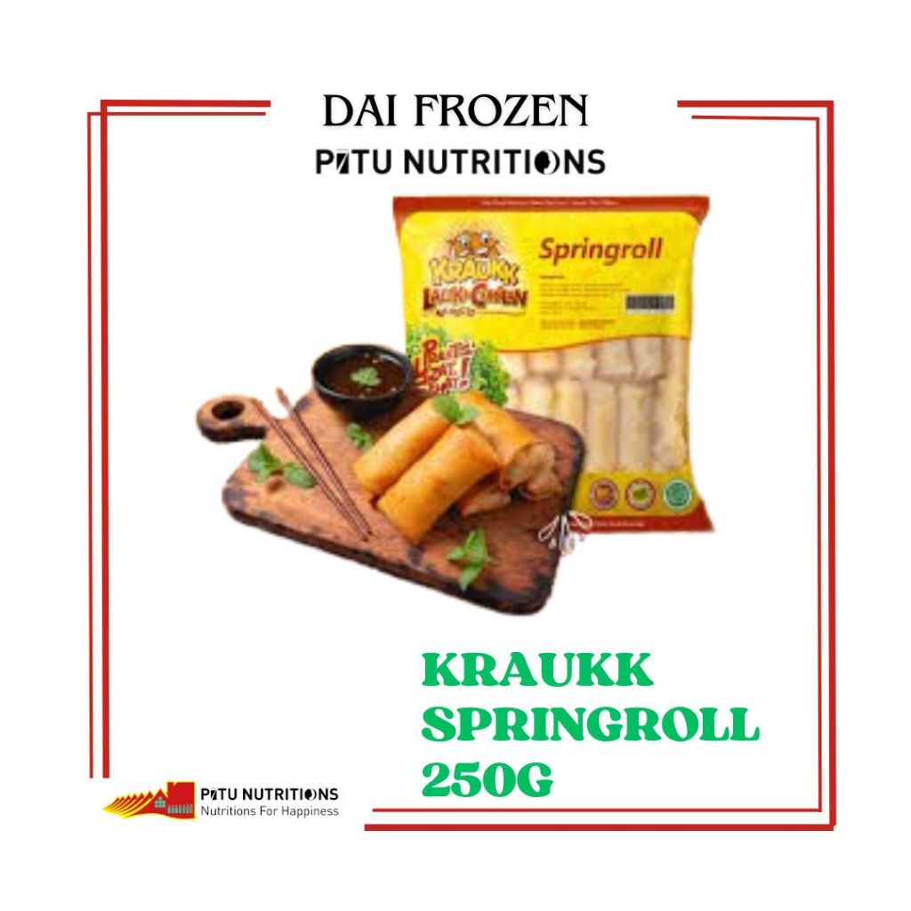 Kraukk Spring Rolls Frozen Food [250 g/ 15 pcs] merupakan spring rolls berbentuk lumpia mini dengan panjang sekitar 8 hingga 10 cm. Ketebalan tekstur produk frozen food satu ini dinilai sangat pas di lidah para penikmatnya. Selain itu, rasa gurih dan lezat yang berpadu dengan campuran bahan-bahan pilihan seperti udang, ikan, jamur dan sayur-sayuran. Setelah bahan-bahan tersebut disatukan maka selanjutnya bahan-bahan tersebut dibungkus menggunakan kulit lumpia yang akan menambah citarasa gurih dari produk ini ketika dirasakan oleh penikmatnya. Mengadung berbagai kandungan bermanfaat diantaranya :