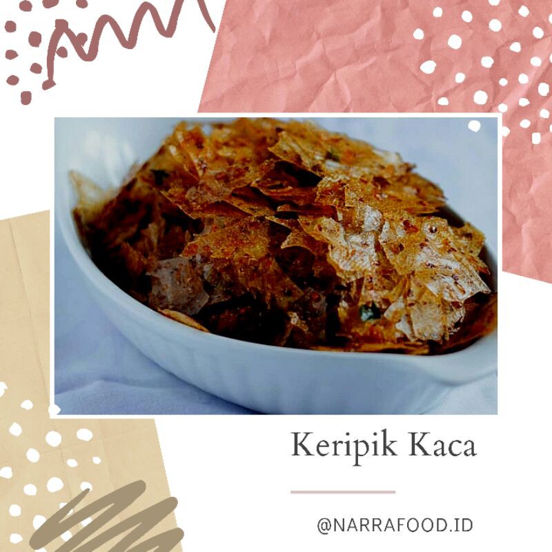 Adonan tepung yang dikeringkan dan dimasak dengan bumbu khas dan cabe segar asli ditambah dengan irisan daun jeruk yang membuat kripik kaca menjadi lebih sedap dan nikmat