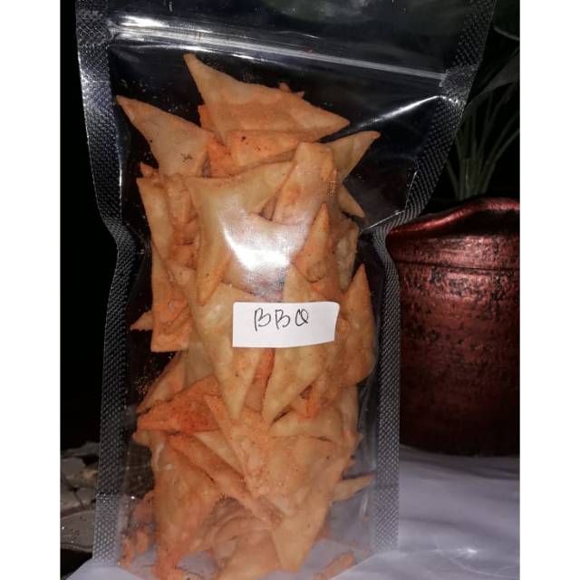 Ready kripik pangsit rasa BBQnya kak, gurih renyah, dan dijamin halal, cocok untuk camilan atau teman makan, harga terjangkau, bikin ketagihan..