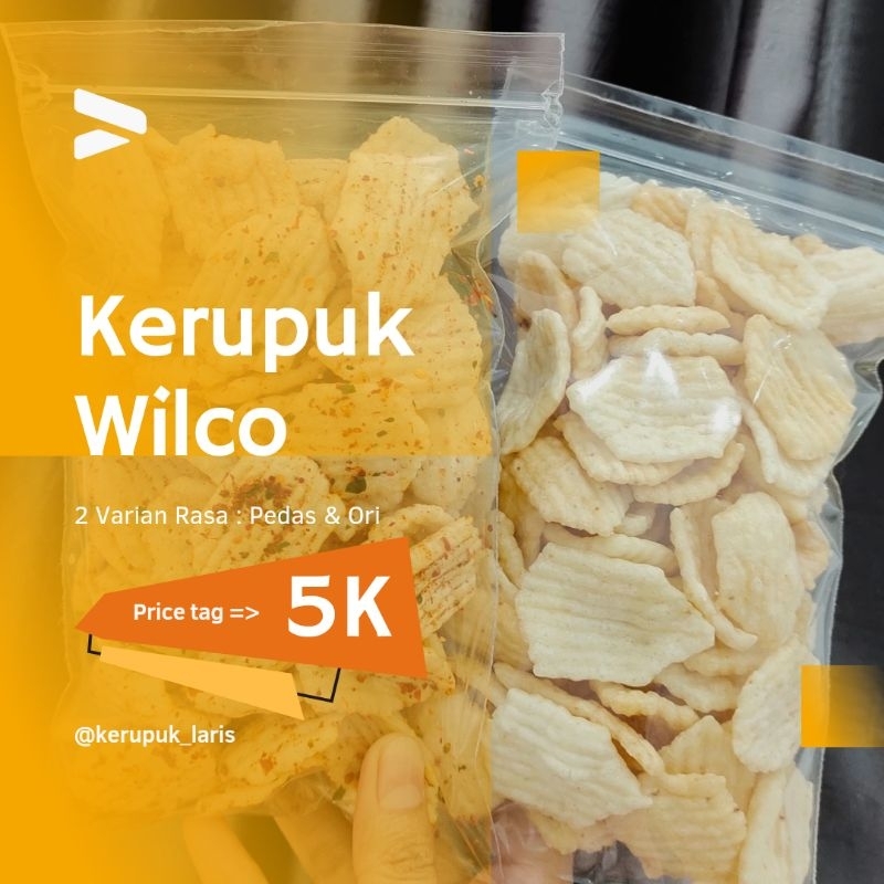 Kripik Wilco Rasa Original 100gr adalah produk yang dijual dengan harga Rp. 5000 per pcs dengan berat 100gr. Terdapat 2 varian rasa yaitu Rasa Original dan Rasa Pedas Daun Jeruk.