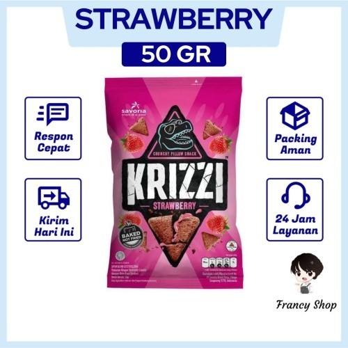 KRIZZI! Snack isi cream dengan rasa stroberi yang renyah dan lezat. Mengandung susu dan tepung gandum. Cemilan ini pun bebas dimakan tanpa merasa bersalah, karena snack ini dipanggang bukan digoreng.