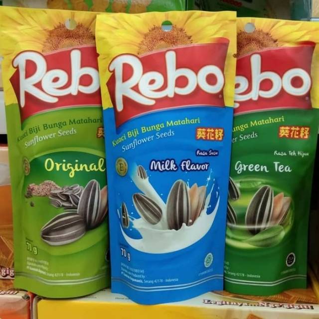 Makanan ringan Rebo, terbuat dari biji matahari, sangat cocok utk cemilan, atau acara lainnya...ada 3 macam rasa, diantaranya: Milk, Original dan Green Tea..