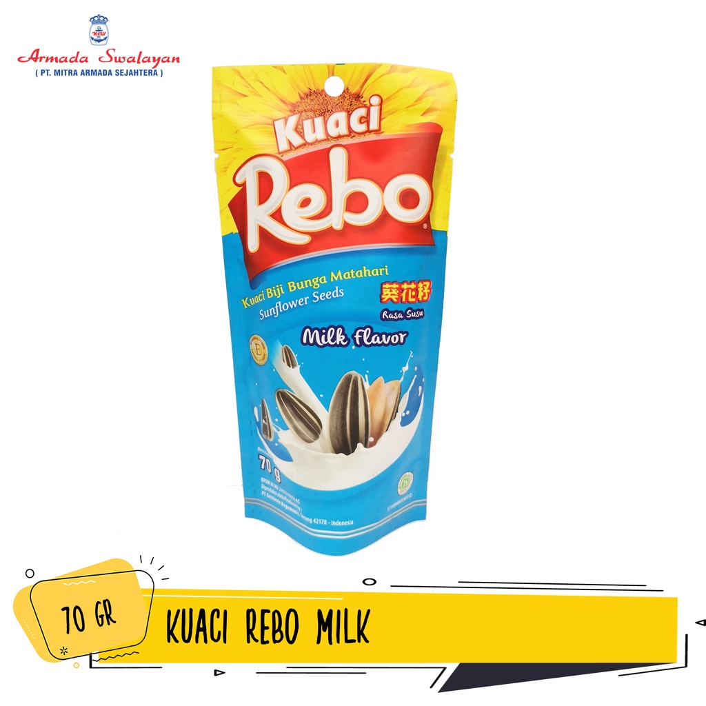 Kuaci Rebo terbuat dari biji bunga matahari dan mengandung vitamin E. Diolah secara higienis menggunakan teknologi modern. Sangat cocok untuk dijadikan teman camilan yang seru. Praktis untuk dinikmati saat kumpul bersama teman dan keluarga.