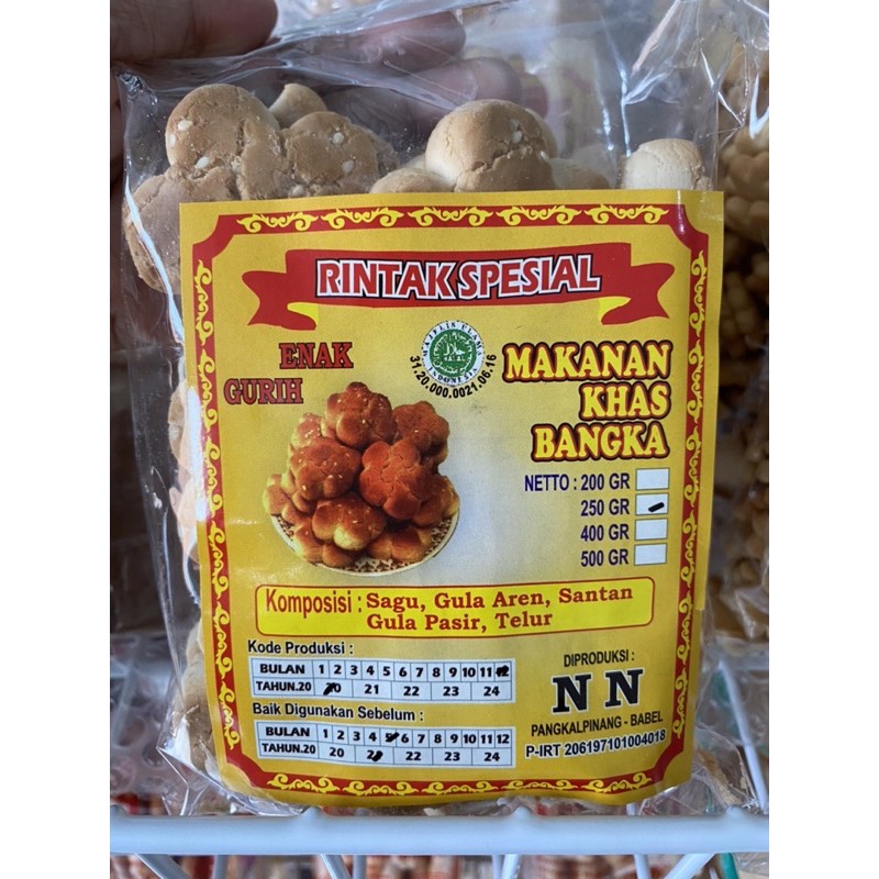 Kue khas Bangka yang garing dan lembut ketika dimakan. Perpaduan gula aren, santan, dan sagu yang nikmat membuat kita susah berenti makan. Kue ini mirip kue bangkit yang garing namin lembut dimulut. Dapat disajikan untuk teman ngopi ataupun teh dan cocok untuk disantap oleh anak-anak.