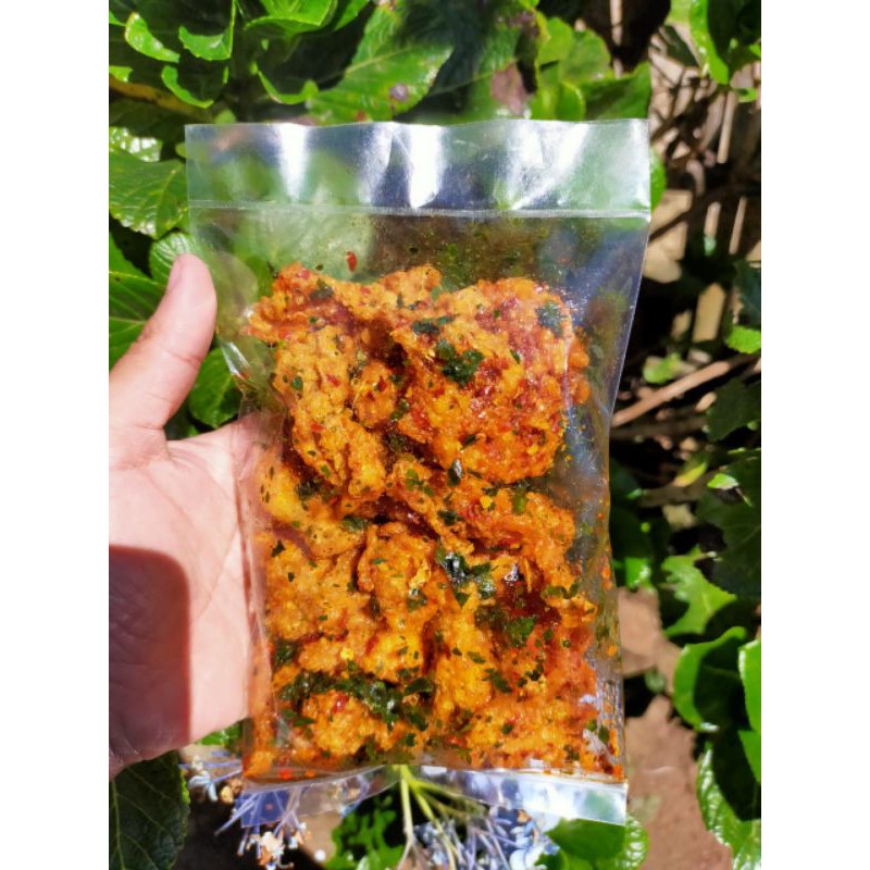kulit ayam crispy dengan bumbu gurih pedas dan daun jeruk yang melimpah.