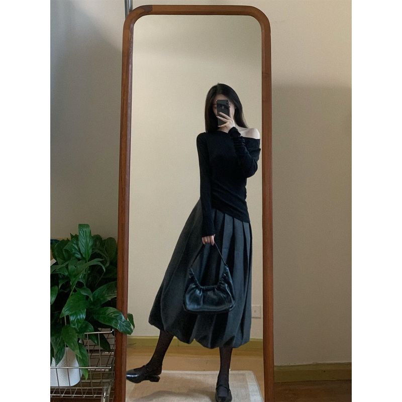 Kumikumi Чистый Желание Стиль Комплект Скошенный Плечевой Темперамент Рубашка с Длинными Рукавами Женская Осень Высокая Талия Приталенная Юбка Комплект из Двух Предметов Top L