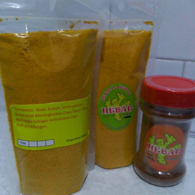 Untuk kemasan plastik beratnya 180gr dengan komposisi campuran gula, sedangkan untuk kemasan botol beratnya 60gr dengan komposisi murni dari sari kunyit.
