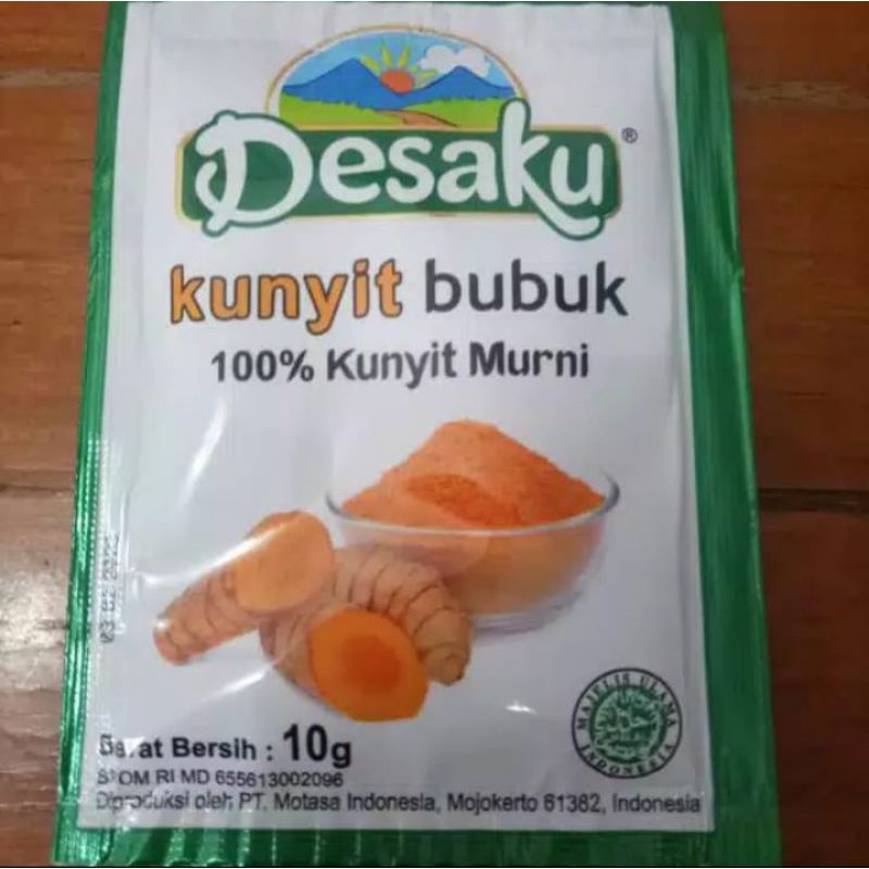 Kunyit bubuk merk Desaku, kemasan sachet 10gr. 100% kunyit asli. Minimum pembelian 10 sachet.
