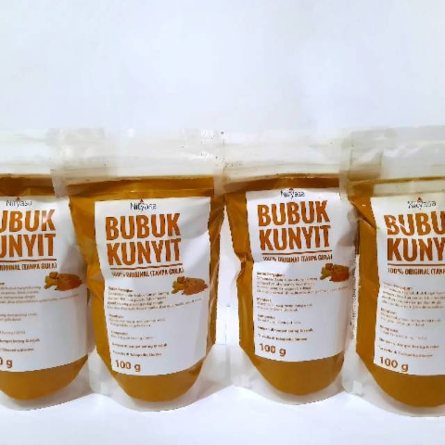 Campurkan 2 sdm bubuk kunyit kuning dengan 100 ml air panas. Aduk merata, diamkan sampai mengendap dingin.