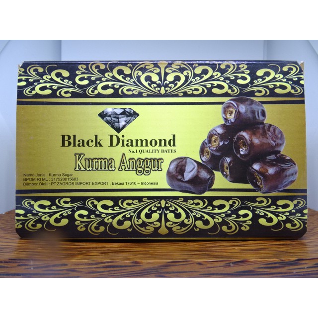 kurma anggur disebut juga kurma bam. Kurma Anggur Black Diamond menggunakan jenis kurma anggur hitam yang berbeda dipasaran, rata-rata menggunakan jenis kurma anggur merah. dan kurma anggur Black diamond merupakan merk dengan kualitas terbaik diantara merk lainnya. memiliki cita rasa yang tinggi dengan kualitas premium.