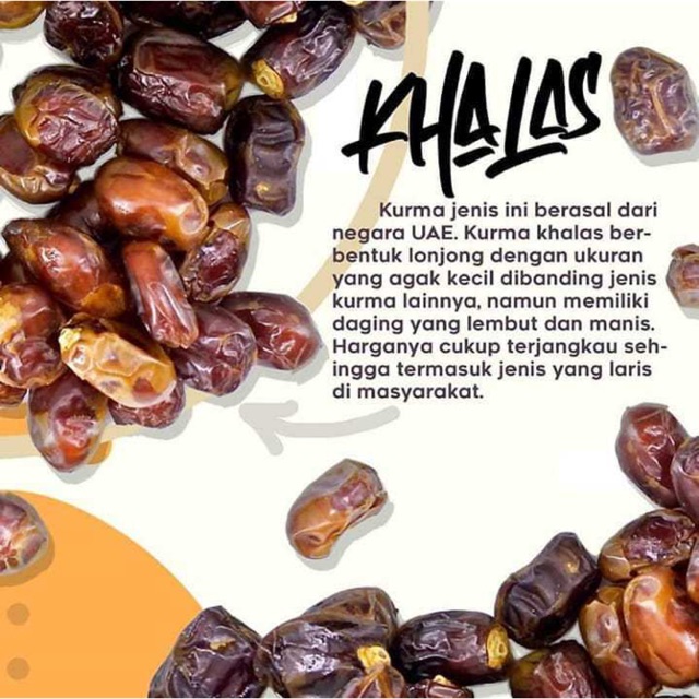 Kurma Emirates Khalas adalah salah satu jenis kurma dari Uni Emirat Arab yang cukup populer di Indonesia. Rasanya yang enak dengan harga yang terjangkau membuatnya laris manis di pasaran dalam negeri kita.