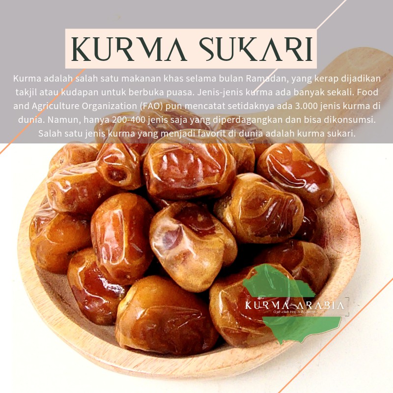 Kurma Sukari atau biasa disebut juga Kurma Raja merupakan kurma yang memiliki tekstur daging buah yang lembut, manis, empuk dan warna kurma kuning kecoklatan.