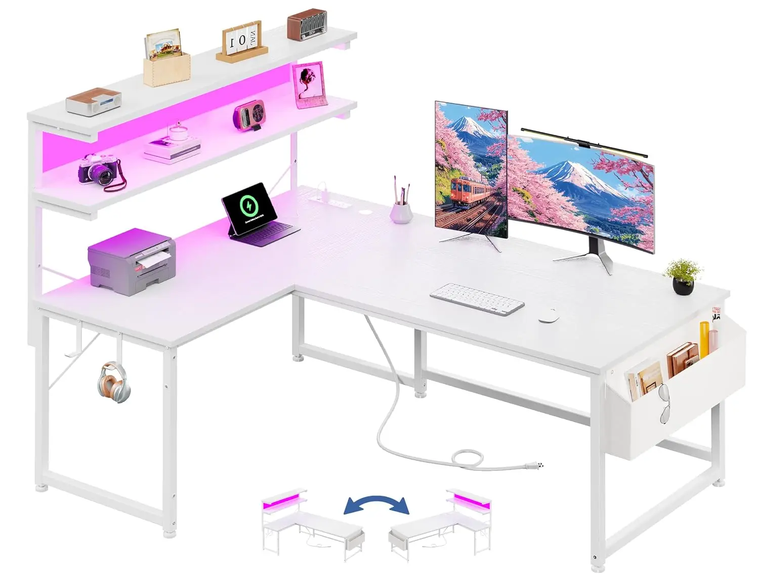 L Shaped Computer Desk LED Power Outlet Shelf Storage Bag Hook 43.3 Inch Reversible Gaming Home Office, Customized