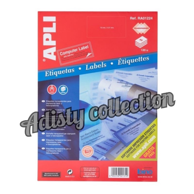 Label polyester transparan cocok untuk digunakan di tempat dimana diperlukan label yang tahan lama seperti pemakaian di luar ruangan. Terbuat dari bahan yang bermutu tinggi dan dapat dicetak dengan printer laser dan mesin fotokopi. Tipe RA01224 dalam kemasan Blister 1 pack berisi 5 lembar, dalam 1 lembar berisi 24 buah sticker berukuran 70,0 x 37,0 mm dengan model square corner (sudut tajam di setiap ujungnya). total sticker dalam 1 pack = 120 buah sticker
