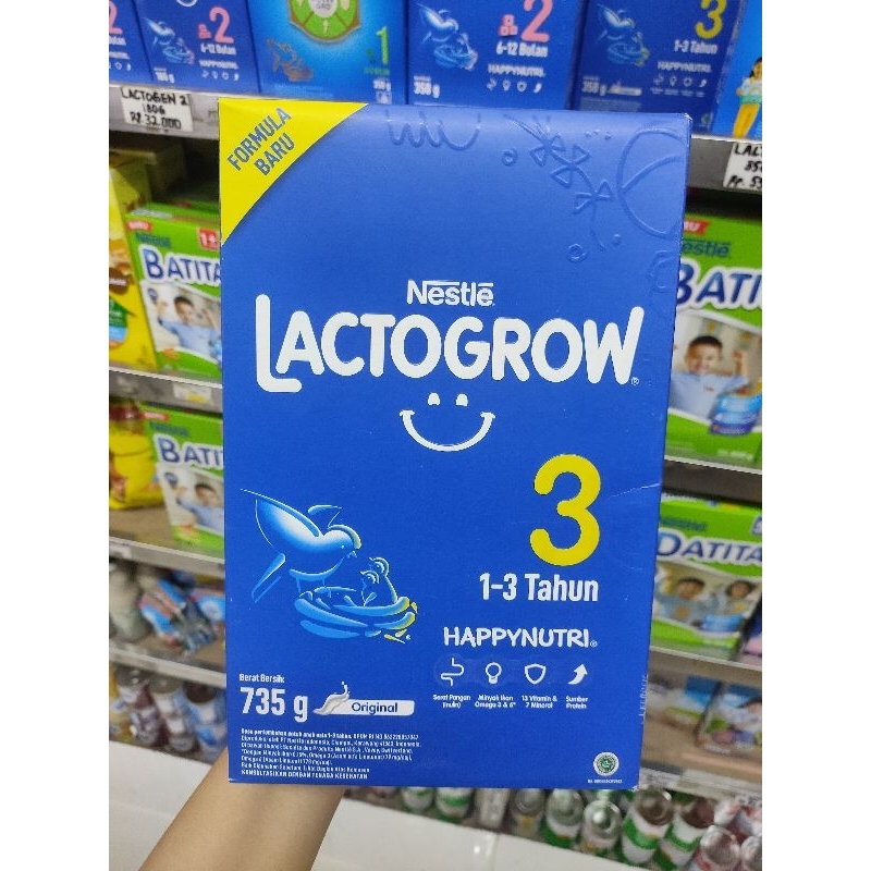Lactogrow 3 adalah susu formula lanjutan untuk pertumbuhan bayi untuk usia 1-3 tahun dan bukan sebagai pengganti ASI. Lactogrow 3 mengandung zat gizi makro dan mikro untuk pertumbuhan si kecil. Kandungan Probiotik di dalamnya akan membantu mempertahankan fungsi saluran cerna. Lactogrow 3 dilengkapi dengan Probiotik, DHA, LA & ALA, serta Kalsium untuk proses tumbuh kembang anak.