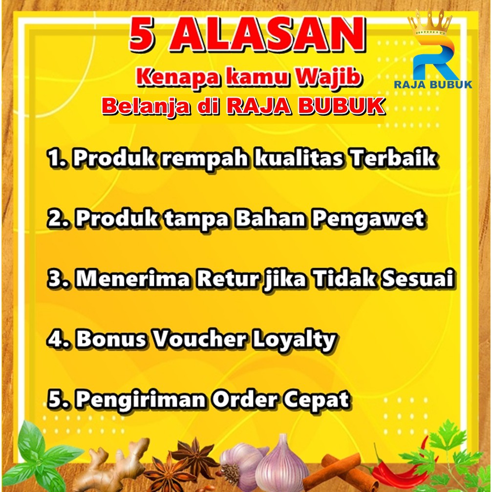 RAJA BUBUK adalah produsen berbagai macam rempah-rempah yang dijadikan bubuk sehingga menjadikan rempah-rempah ini praktis untuk digunakan. Produk kami merupakan produk ORIGINAL 100%. Diolah langsung dari hasil alam rempah nusantara tanpa bahan pengawet apapun.