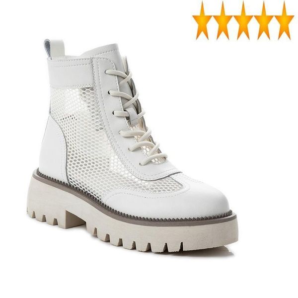 boots women mesh summer breathable patchwork lace up round toe high heel leather shoes fashion female ankle length work, Black