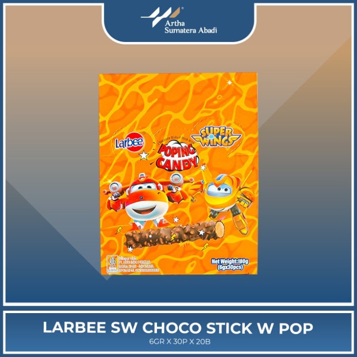 Larbee SW Choco Stick W Pop adalah camilan lezat yang menggabungkan biskuit stik cokelat dengan sensasi unik popping candy yang meletup di mulut. Dikemas dengan desain menarik bertema Super Wings, produk ini menghadirkan pengalaman ngemil yang seru dan menyenangkan untuk anak-anak maupun orang dewasa.