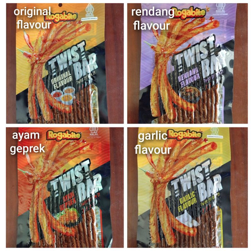 Rogabite Twist Bar adalah camilan yang terbuat dari 100% bahan nabati dan bumbu-bumbu khas Indonesia, seperti pedas, rendang, dan kari. Camilan ini digemari karena rasa unik dan bahan-bahan berkualitas. Twist Bar juga terkenal karena kandungan proteinnya yang tinggi.