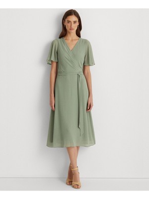 LAUREN RALPH LAUREN Женское платье миди зеленого цвета на подкладке с завязками на поясе и развевающимися рукавами, Зеленый