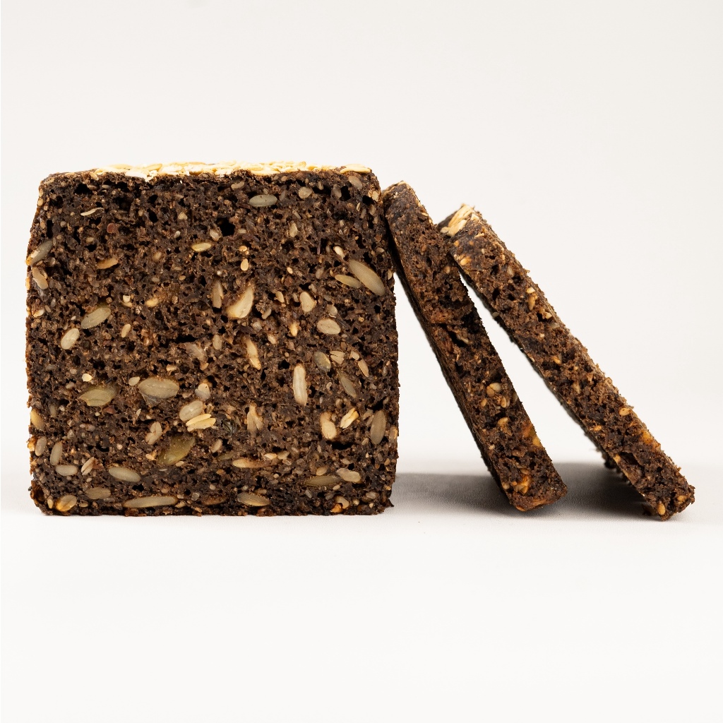Nutrient-dense bread made of dark rye berries, black rice, varieties of ancient grains and seeds.