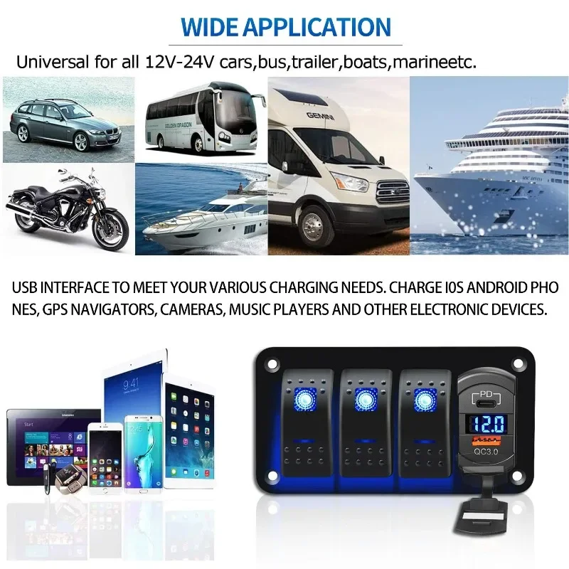 LED Rocker Switch Car Charger, Waterproof Power Panel for Yacht Bus RV