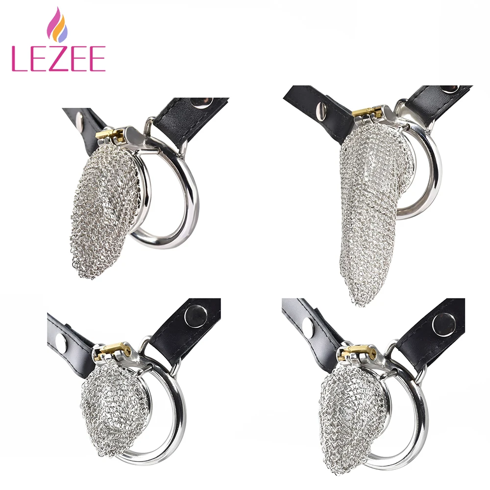 LEZEE нержавеющая сталь мужская марлевая клетка верности полые сетчатые замки для пениса сетчатые кольца на пенис с PU поясом взрослые секс-игрушки для мужчин